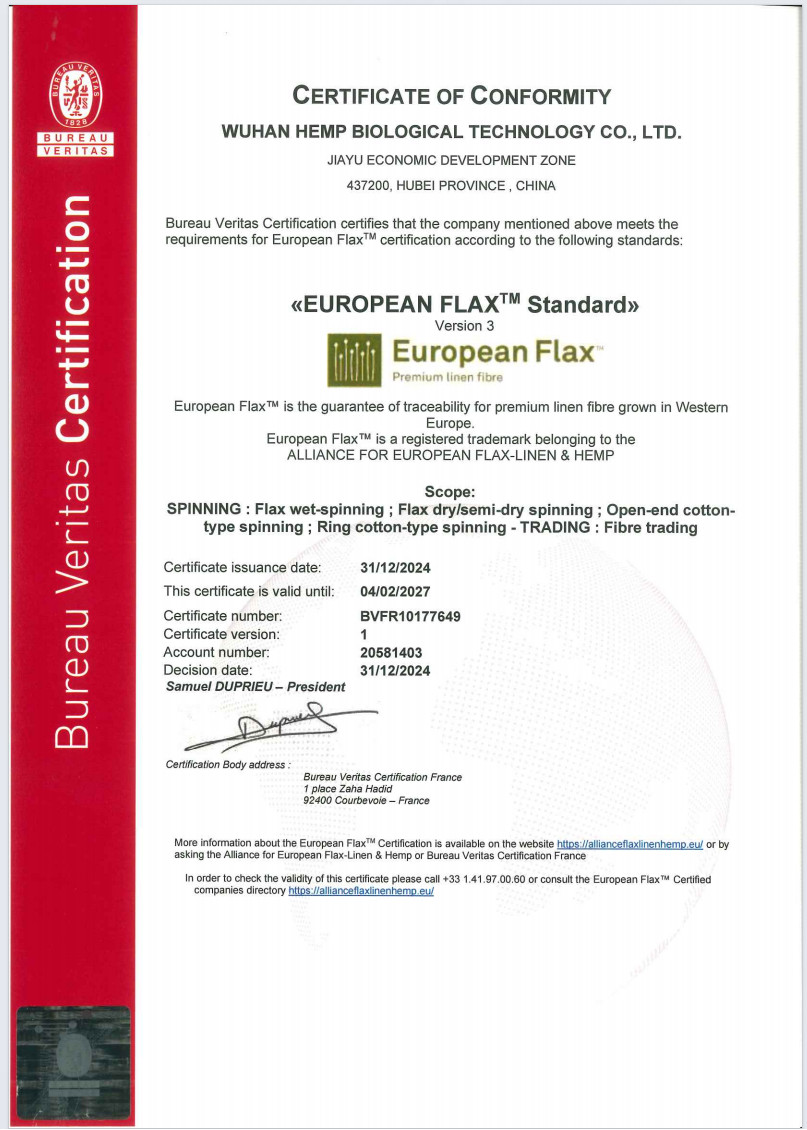 我司通过欧洲亚麻与大麻联盟(CELC)授权、必维国际检验集团(Bureau Veritas)的严苛审核,正式获得EUROPEAN FLAX®(欧麻)认证,标志着公司在亚麻原料品质、生产环保标准及全产业链可追溯性方面,达到欧盟权威认可的国际一流水平,为产品进军全球高端市场奠定坚实基础。